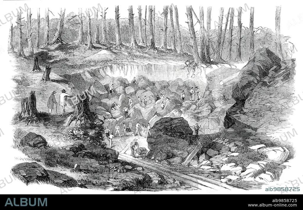 Copper mine or quarry, near Montreal, Canada - from a sketch by our special artist, G. A. Andrews, 1860. Excitement due to the '...discovery of an immense deposit of copper ore in the hillside near the village of Acton, Canada East...Excursion-trains run from Montreal expressly to visit the mines; and, as the proprietor makes a charge for admission...he is likely to make a rich harvest of gold and silver, as well as of copper, by his discovery...The face of a considerable hill has been laid open, and what appears a large stone quarry is being worked by about a hundred men, who are continually blasting with gunpowder, and using all the ordinary means for getting out blocks of dark grey stone, which, on a closer examination, will be found to be good rich copper ore...the whole mass of the hill appears to be of the same valuable material...The overburden is a yellow loamy sand, about eight feet thick, immediately under which is the metal-bearing rock...At the excavation the roots of the trees can be seen penetrating through the loam into the cracks and fissures of the rock which carries the metal. The yield of copper is eleven tons of ore, carrying 20 per cent of copper, for every cubic fathom of rock excavated'. From "Illustrated London News", 1860.