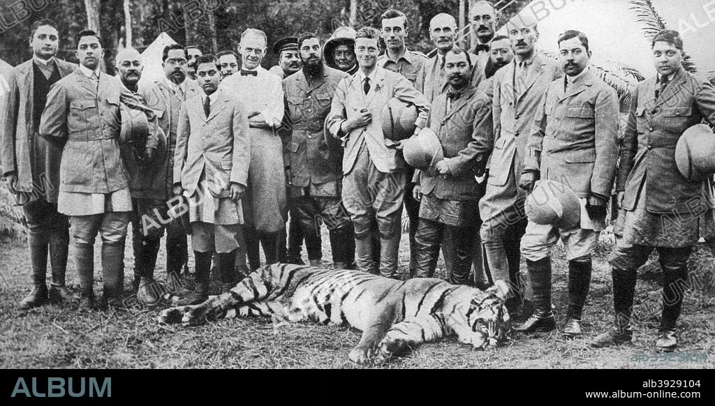 The Prince of Wales tiger shooting in Nepal, the Indian Tour, 1921. The future King Edward VIII and his entourage pose with a dead tiger. Illustration from George V and Edward VIII, A Royal Souvenir, by FGH Salusbury, a souvenir book published as Edward VIII was crowned following the death of his father, George V, (Daily Express Publication, London, 1936).