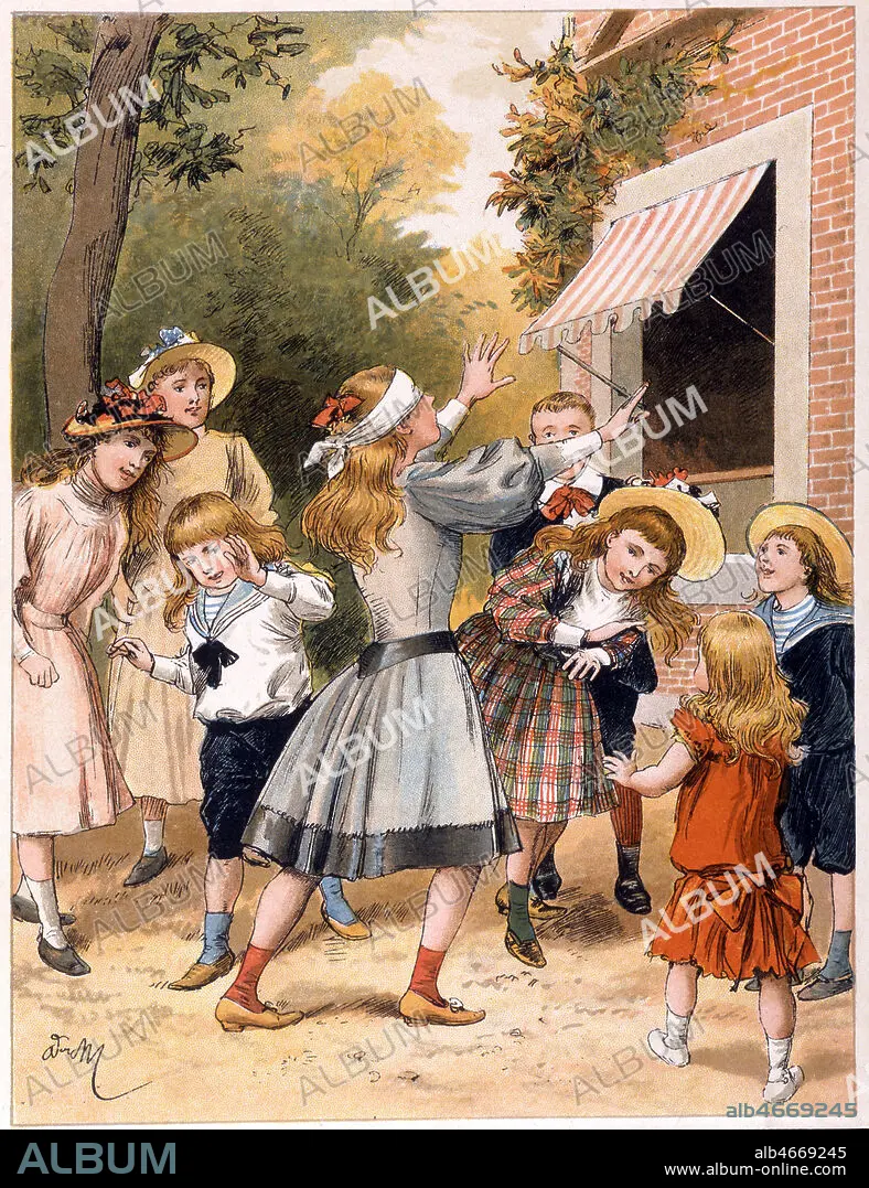Enfants jouant a colin-maillard. Illustration par A. MARIE (1848-1891) pour 'Tout a la joie' de ZARI, 1890. Credit : Collection KHARBINE-TAPABOR.