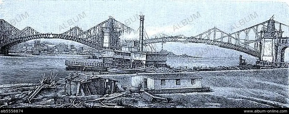Die Brücke über den Fluss Mississippi in der Nähe von St. Louis im Bau, USA, Historisch, digital restaurierte Reproduktion einer Originalvorlage aus dem 19. Jahrhundert, North America.