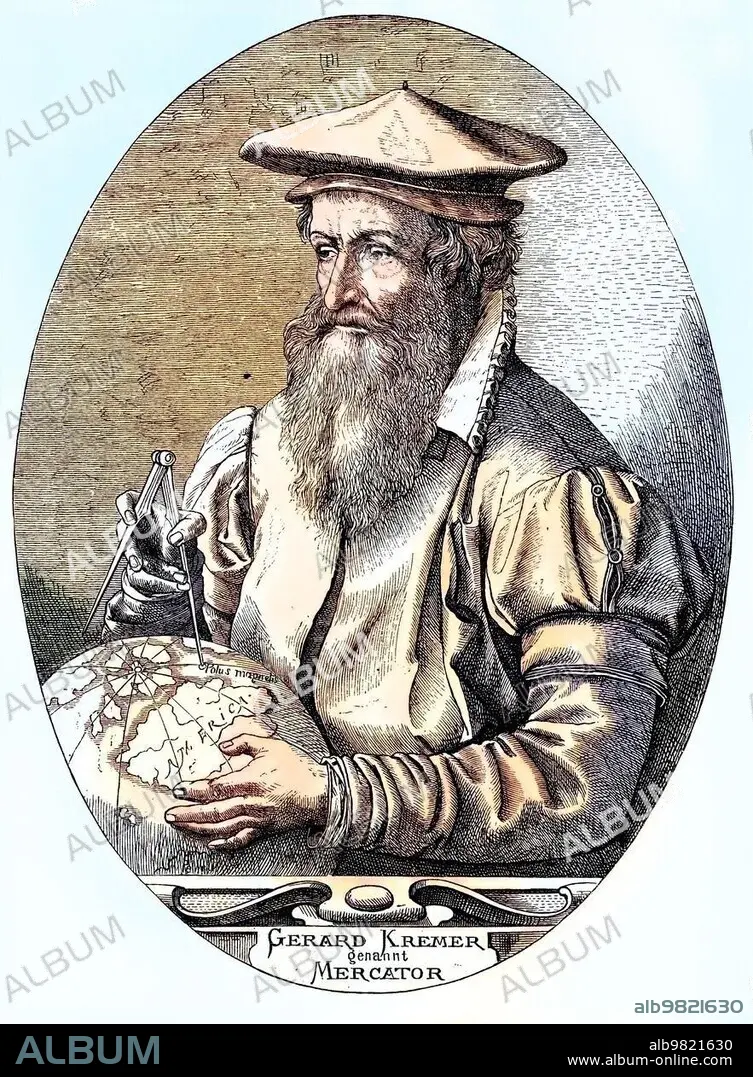 Caption: Gerhard Mercator; Gerard De Kremer; Gerardus Mercator or Gerhard Kraemer; 1512-1594; a mathematician; geographer; philosopher; theologian and cartographer; historical engraving; circa. 1870; Historic; digitally restored reproduction from a 19th century original; coloured; exact date unknown
