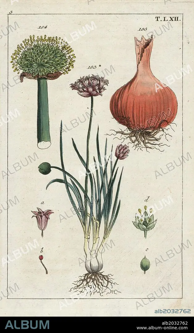 Caption: Chives, Allium schoenoprasum 183, and Welsh onion, Allium fistulosum, flower 184 and bulb 185. Handcolored copperplate engraving of a botanical illustration from G. T. Wilhelm's "Unterhaltungen aus der Naturgeschichte" (Encyclopedia of Natural History), Augsburg, 1811. Gottlieb Tobias Wilhelm (1758-1811) was a clergyman and naturalist in Augsburg, Bavaria.