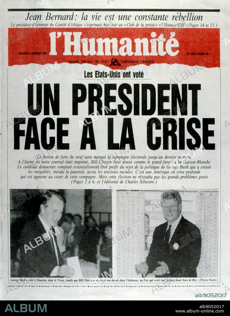 Caption: Headline in the French newspaper 'L'Humanite' concerning the United States Presidential Election November 1992. Incumbent President George Bush lost against Governor Bill Clinton.
