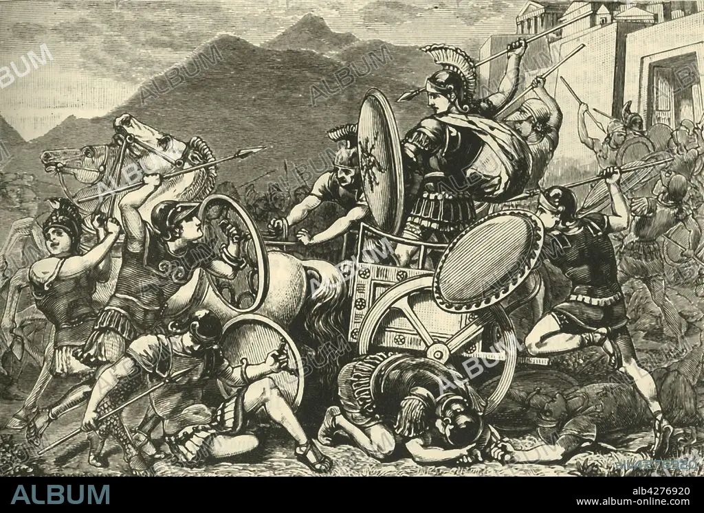 Caption: 'Aristomenes Fighting His Way Out of Eira', 1890. Aristomenes, king of Messenia, celebrated for his struggle with the Spartans c685BC and resistance to them on Mount Eira for eleven years. From "Cassell's Illustrated Universal History, Vol. I - Early and Greek History", by Edmund Ollier. [Cassell and Company, Limited, London, Paris and Melbourne, 1890]