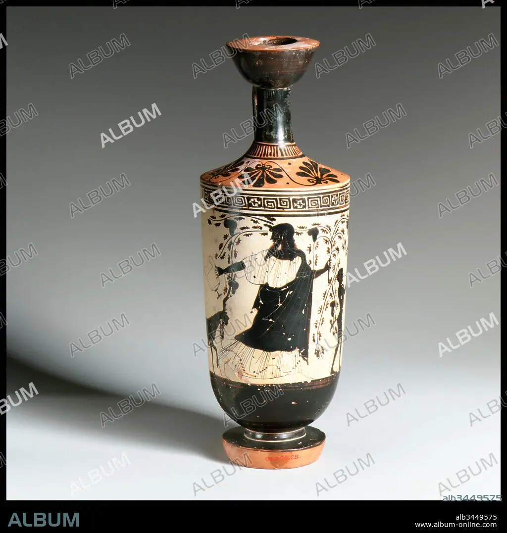 Caption: Terracotta lekythos (oil flask), Classical, ca. 480 B.C., Greek, Attic, Terracotta; black-figure, white-ground, 9 5/16 x 3 1/4 in. (23.7 x 8.3 cm), Vases, Dionysos (god of wine) with a satyr and goat. The decoration on the body is executed in a combination of black silhouette and outline drawing on a white ground. Such works, known as semioutline lekythoi, are associated with the workshops of two closely related artists, the Bowdoin Painter and the Athena Painter