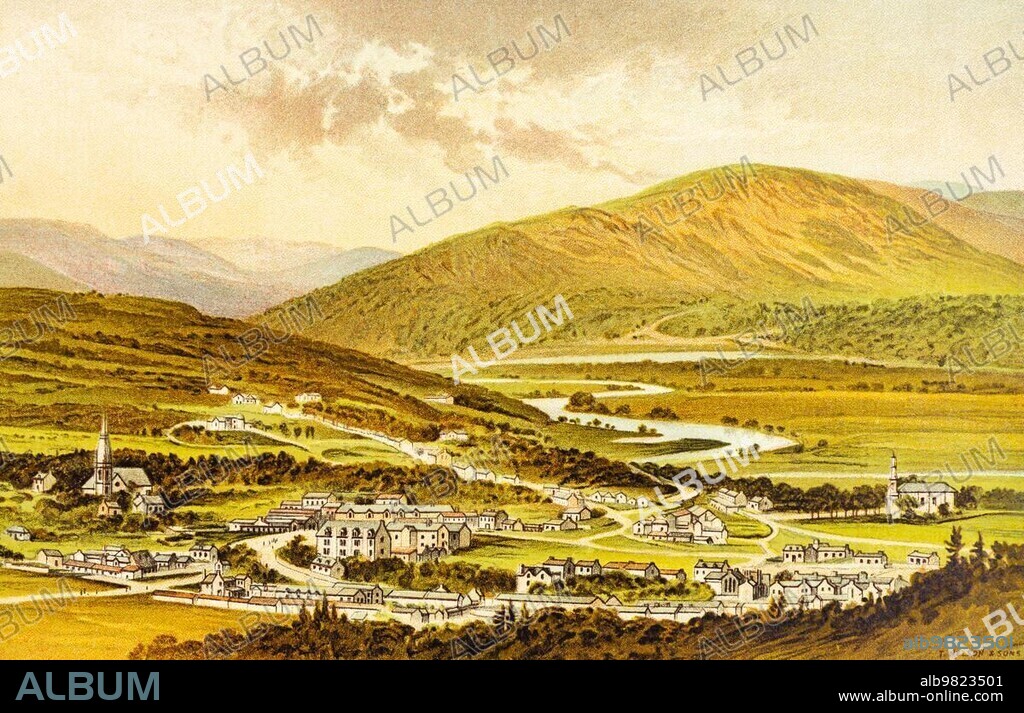 Braemar; Grampian Mountains; River Dee; mountains; Grampian Mountains; mountain landscape; famous; royal highland games; royal highland games; September; autumn; historical illustration 1889; Scotland; Great Britain