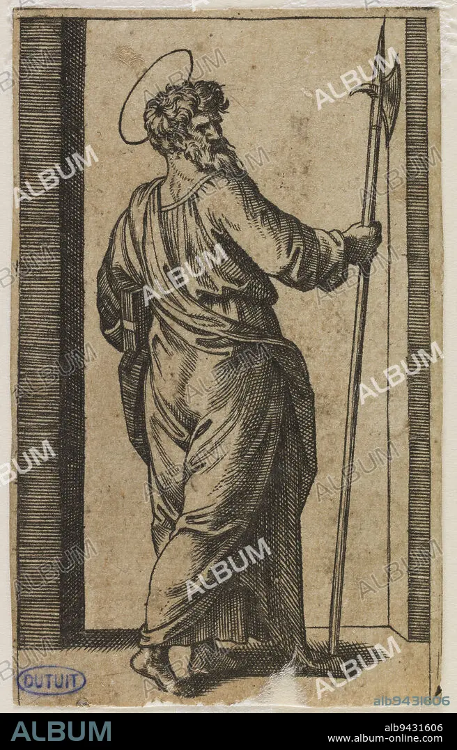 Caption: Jesus Christ and the apostles, Saint Judas Thaddeus. Eleventh number of a suite of 13 pieces, part 1), page 165), Raimondi, Marc Antoine, Engraver, 16th century, Graphic Art, Print, Original Etching, Etching, Burin, Height: 8.3 cm, Width: 5 cm