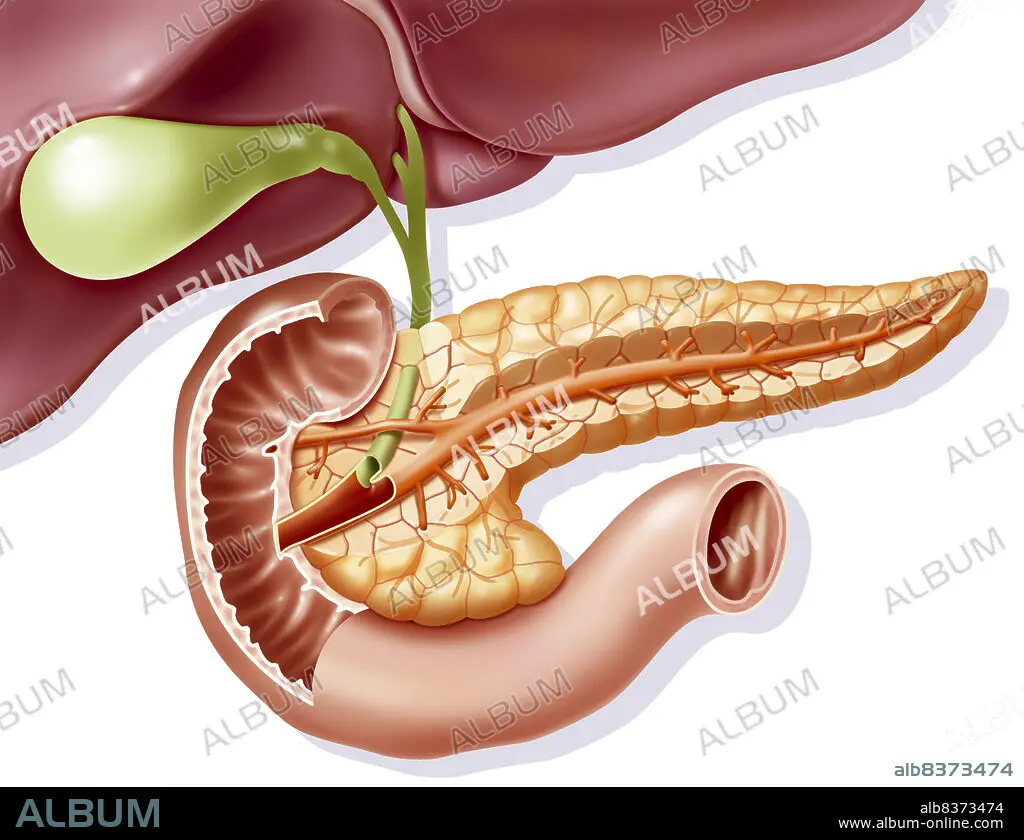 Caption: Représentation de l'anatomie du pancréas en coupe en vue antérieure avec ses rapports avec la vésicule et le canal cholédoque (vert), le duodénum en coupe(beige foncé) et le foie (brun rouge).. Représentation en transparence en orange foncé des canaux pancréatiques.