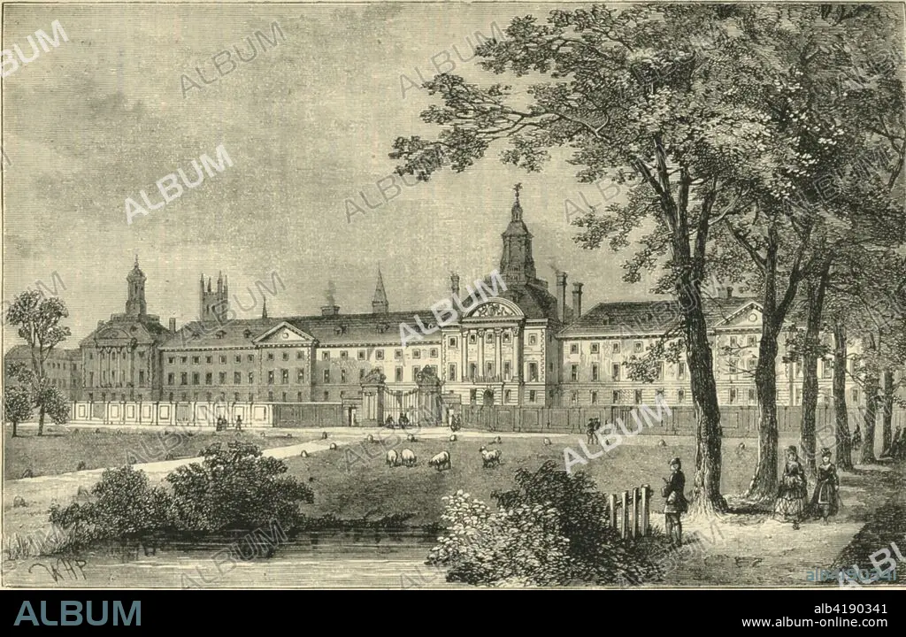 Caption: 'Old Bethlehem Hospital, Moorfields about 1750', (c1872). View of the Bethlem Royal Hospital, a psychiatric hospital in London dating back to the 13th century. The building at Moorfields (seen here), was designed by natural philosopher and City Surveyor Robert Hooke, and constructed between 1675 and 1676. The term 'bedlam' is derived from the hospital's prior nickname, (a corruption of Bethlehem). From Old and New London, Vol. II: A Narrative of Its History, Its People, and Its Places, by Walter Thornbury. [Cassell, Petter, Galpin & Co., London, Paris & New York]