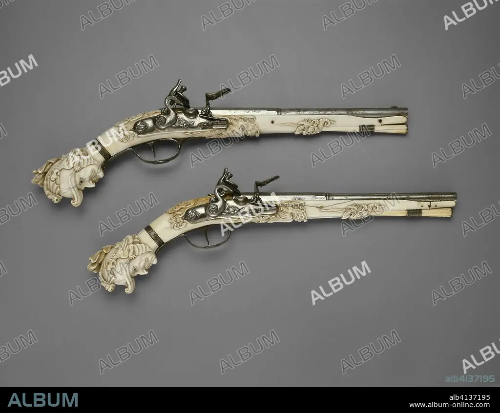 Caption: Pair of Flintlock Pistols. Dutch, Maastricht. Date: 1655-1670. Dimensions: L. 45.6 cm (17 15/16 in.). Steel, silver, ivory, ebony, leather, and flint. Origin: Maastricht.