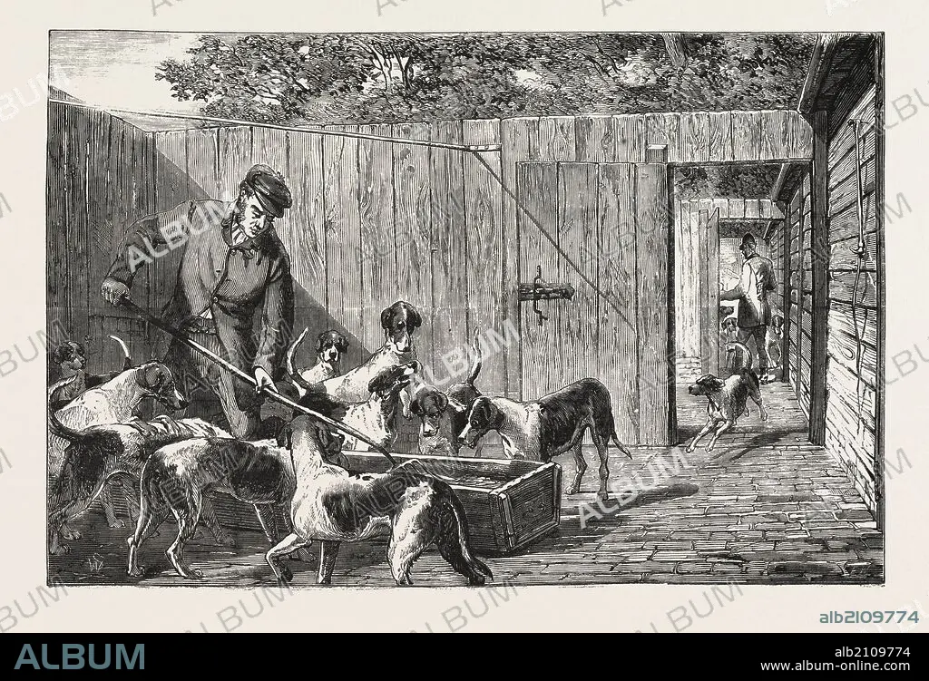 Caption: FOX HUNTING, BREAKFAST TIME AT THE KENNELS, HUNT, ENGRAVING 1876, UK, britain, british, europe, united kingdom, great britain, european