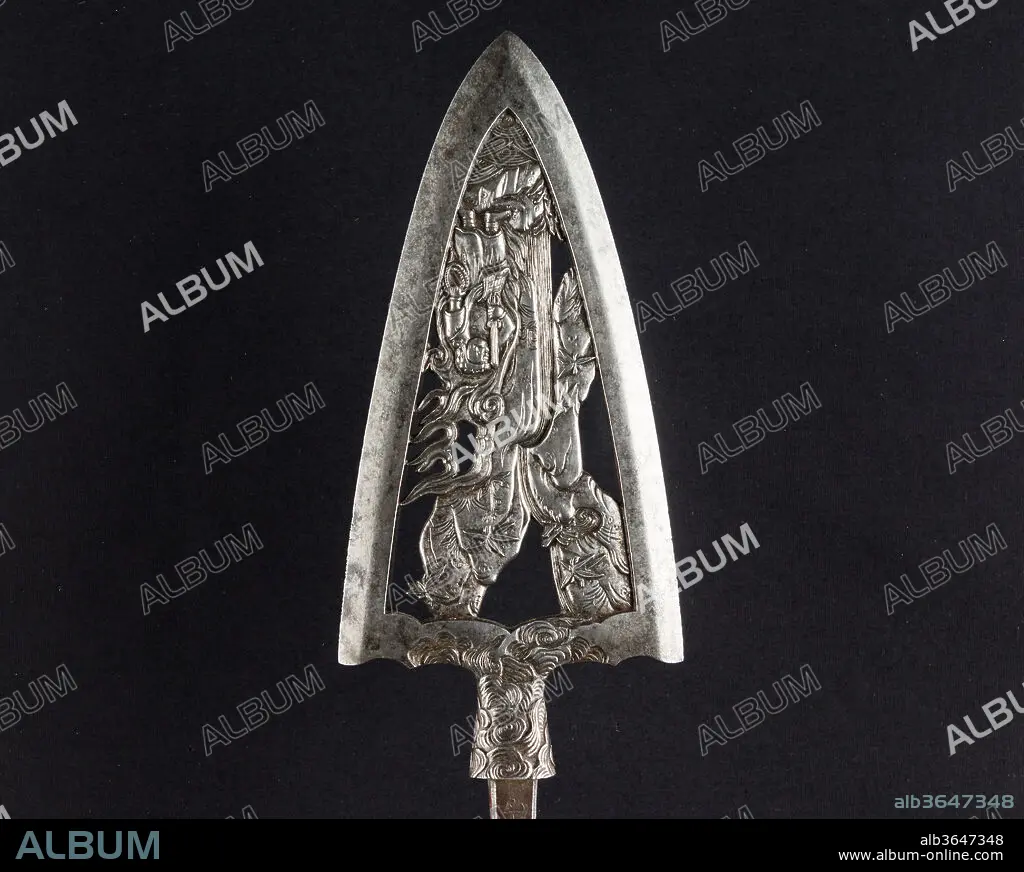 Large arrowheads, pierced and elaborately chiseled with landscapes, birds, flowers, dragons, and Buddhist divinities, were created to be admired for the beauty of their metalwork and design rather than for use in archery. This arrowhead is dated 1645 and signed by Umetada Motoshige (died 1675), a member of the Umetada school of swordsmiths, tsuba makers, and iron chiselers. It belongs to a group of more than thirty similarly signed and dated pieces in the Metropolitan Museum's collection (including acc. nos. 32.75.318, .321, .327, .330, .334, .337, .339-.340, .399, .403, .406, .409) that may have been made for presentation or as a votive offering to a shrine. The decoration depicts a landscape witht he Buddhist divinity Fudo Myo-o and a waterfall.