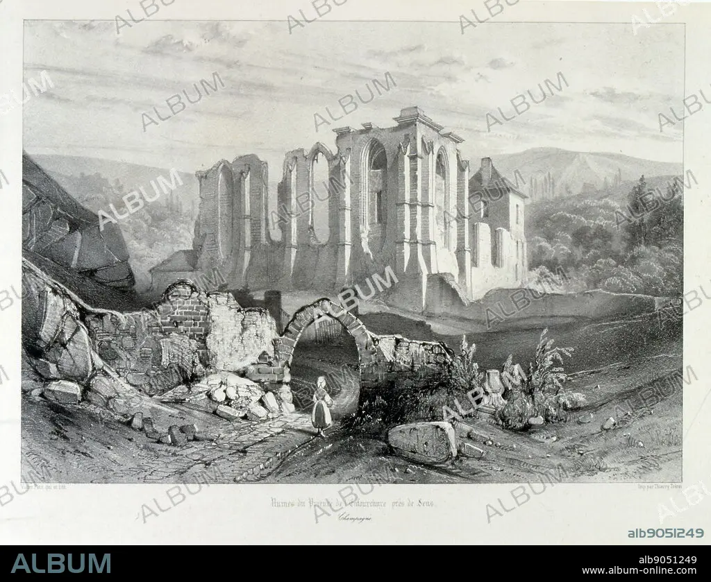Caption: Drawing of the Prieure de l'Enfourchure a Dixmont dans l'Yonne, France, 1857. Founded in 1209 on the edge of Foret d'Othe, the priory was donated by Count Guillaume de Joigny to the Order of Grandmont. It was an austere religious community that had an important spiritual influence in the region. From this priory, ruined by the Hundred Years War, rebuilt in the sixteenth century. and destroyed in the French Revolution.