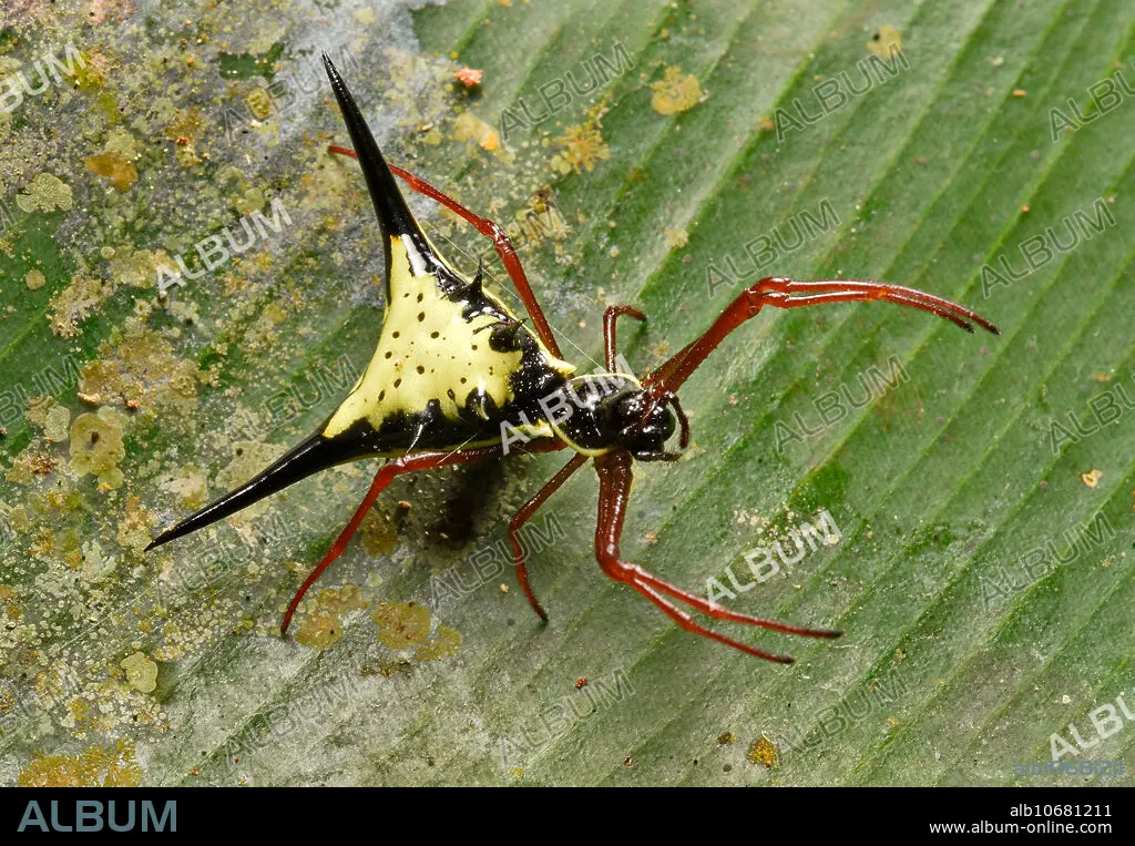 Caption: Spiny Orb Weaver Spider, Micrathena schreibersii, Amazonian Peru. The spines evolved as a predator deterrent.