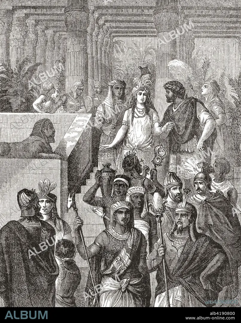 Caption: Antony and Cleopatra in Egypt. Cleopatra VII Philopator, 69 - 30 BC, aka Cleopatra. Last active ruler of the Ptolemaic Kingdom of Egypt. Marcus Antonius, 83 - 30 BC, aka Mark or Marc Antony. Roman politician and general. From Ward and Lock's Illustrated History of the World, published c.1882.