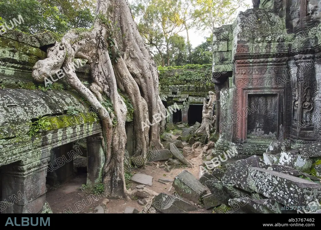 Temple overgrown by jungle, Tetrameles nudiflora tree with roots, Ta Prohm Temple, Angkor, UNESCO World Heritage Site, Siem Reap, Cambodia, Indochina, Southeast Asia, Asia.