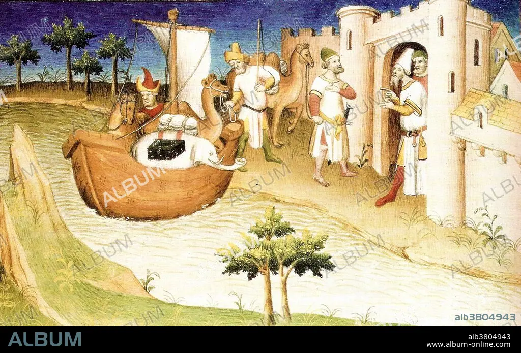 Caption: Marco Polo with elephants and camels in the Gulf of Persia from India. Miniature from the book, The Travels of Marco Polo. Marco Polo (1254-1324) was a Venetian merchant traveler and the most famous Westerner to have traveled on the Silk Road. He excelled all the other travelers in his determination, his writing, and his influence. His journey through Asia lasted 24 years. He reached further than any of his predecessors, beyond Mongolia to China. He became a confidant of Kublai Khan (1214-1294). He traveled the whole of China and returned to tell the tale, which became the greatest travelogue, called The Travels of Marco Polo, that spilled over with sex, violence, suspense, exotic lands, strange people, bizarre practices, eluding marauders, surviving shipwrecks and crossing treacherous deserts. In 1323, Polo was confined to bed, due to illness. He died in January of 1324.