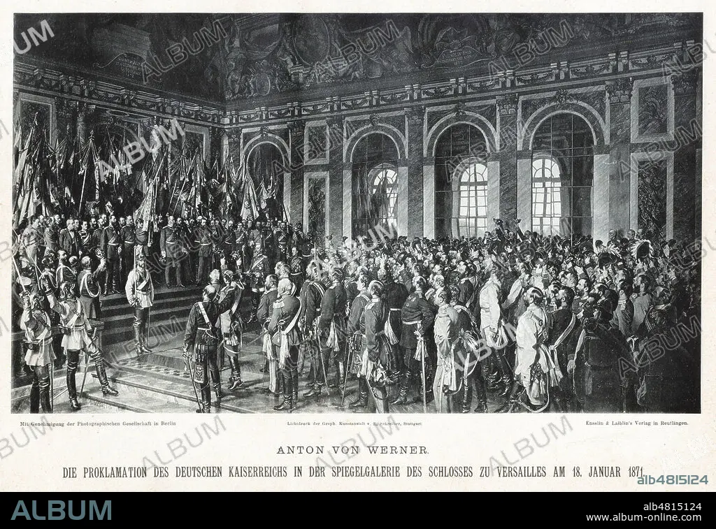 Proclamation de l'Empire d'Allemagne dans la Gallerie des Glaces du Chateau de Versailles le 18 janvier 1871. Gravure d'apres le tableau de Anton von WERNER (1843-1915) tiree de l'ouvrage Der Deutsch Franzosische Krieg publie par Egmont Fehleisen en 1871. Credit : Collection Jonas/KHARBINE-TAPABOR.