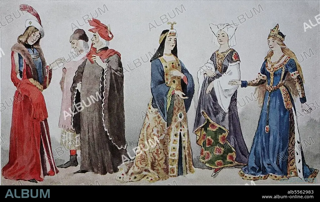 Caption: Kleidung, der ersten Hälfte des fünfzehnten Jahrhunderts, vornehme französische Gesellschaft, von lks, e vornehmer junger Mann, dann zwei ältere Herren, Damen ärmellosen Überwürfen und langen Ärmeln der Unterwäsche, Dame mit doppeltem Schleier und die Przess eem tief ausgeschnittenen, digital verbesserte Reproduktion eer Illustration aus dem 19. Jahrhundert, Mode in Frankreich
