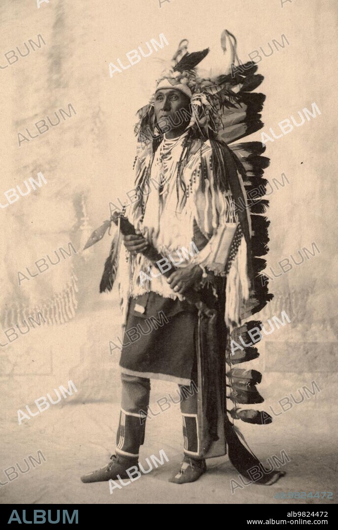 Caption: Spies On The Enemy; Chief with feather headdress; Crow; North American Indian tribe; after a painting by F.A.Rinehart; 1899; Historic; digitally restored reproduction of an original from the period