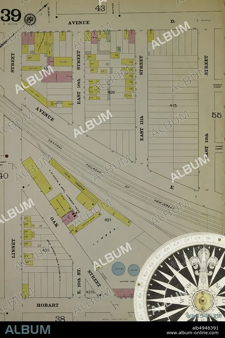 Caption: Image 40 of Sanborn Fire Insurance Map from Hudson Co., Hudson County, New Jersey. Vol. 10, 1898. 129 Sheet(s). Includes Bayonne. Bound, America, street map with a Nineteenth Century compass