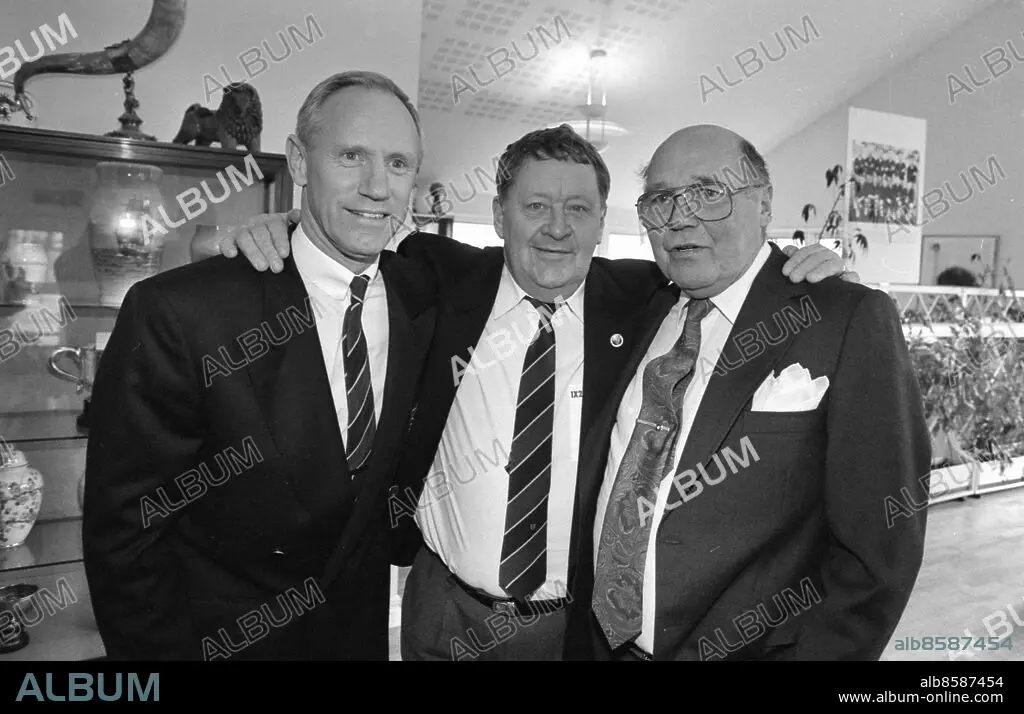 Göteborg 1990-10-31 - Björn Nordqvist och Lars-Gunnar Björklund gratulerar Gunnar Gren på dennes 70-årsdag - *** Local Caption *** GP. KAMERAREPORTAGE