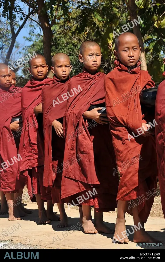 Caption: Buddhist monks collecting alms in, Full Moon Festival in December, Nyaung Shwe, Shan State, Myanmar, Burma, Asia