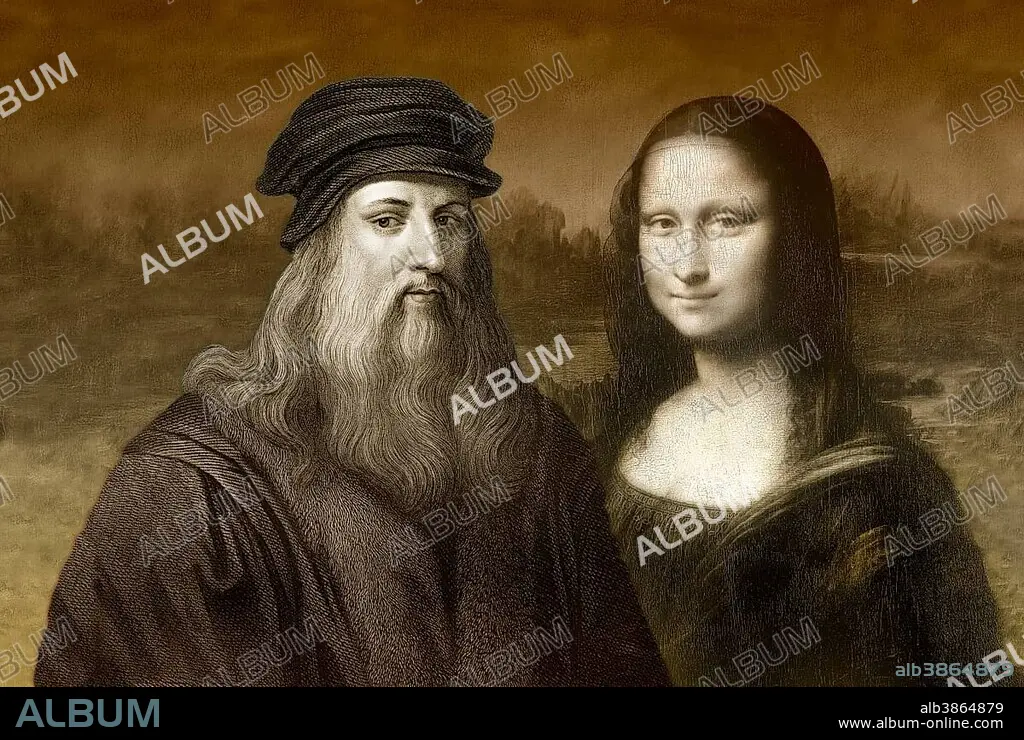 Caption: Painting Mona Lisa and Leonardo da Vinci, Italian painter, sculptor, architect, engineer, historical illustration