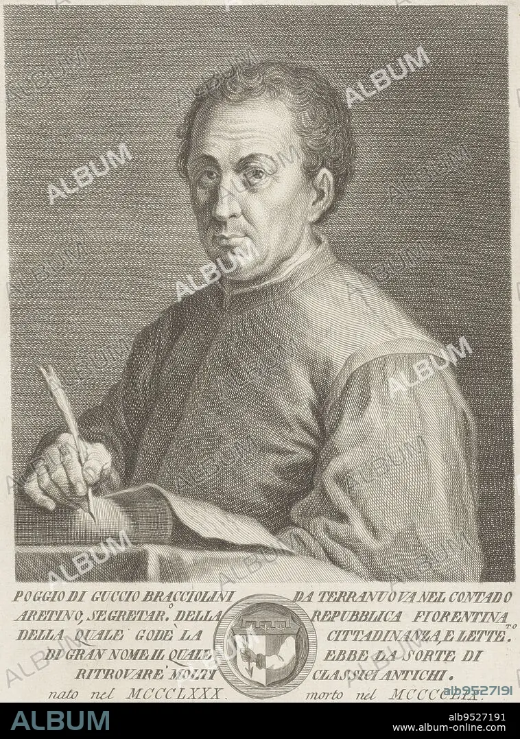 Caption: Portrait of Poggio Bracciolini in the half-calf, sitting behind a table In his right hand a quill Below the portrait a text in Italian and a coat of arms in a circular frame, Portrait of Poggio Bracciolini Portraits of famous Italians with coat of arms in lower margin , print maker: Francesco Allegrini, (mentioned on object), intermediary draughtsman: Giuliano Traballesi, (mentioned on object), Giacomo de Sauboin, (mentioned on object), Italy, 1769, paper, engraving, h 297 mm × w 200 mm