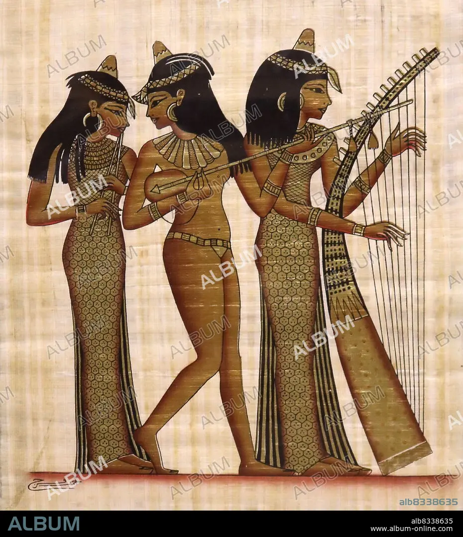 Caption: Modern papyrus depicting 18th Dynasty ancient Egyptian musicians with flute, sitar and harp.