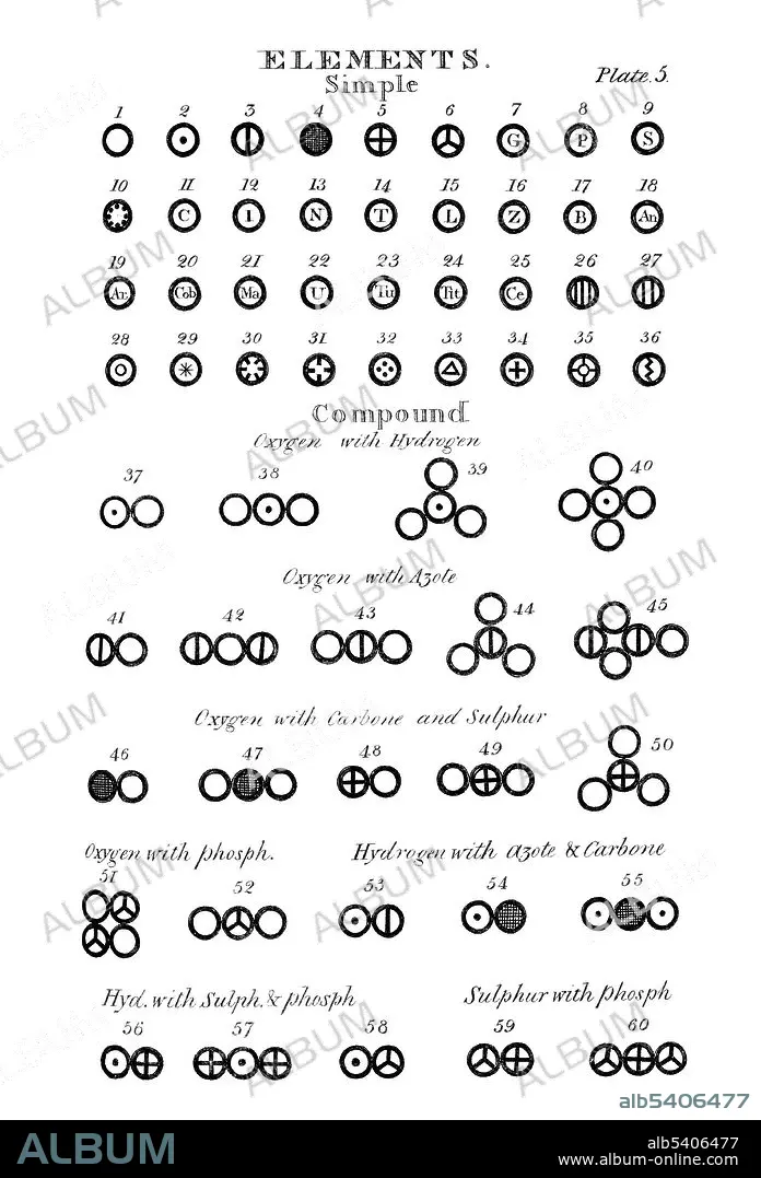 Caption: First edition of A New System of Chemical Philosophy by John Dalton, 1808. Plate 5: Symbols of compound elements. Symbols devised to represent simple and compound elements; they are nearly the same as in plate 4, only extended and corrected. A New System of Chemical Philosophy was a milestone work in the history of chemistry, in which Dalton announced his revolutionary atomic theory and laws of definite and multiple proportions and laid the foundation for the advancement of chemistry in the 19th century. (cropped and cleaned)