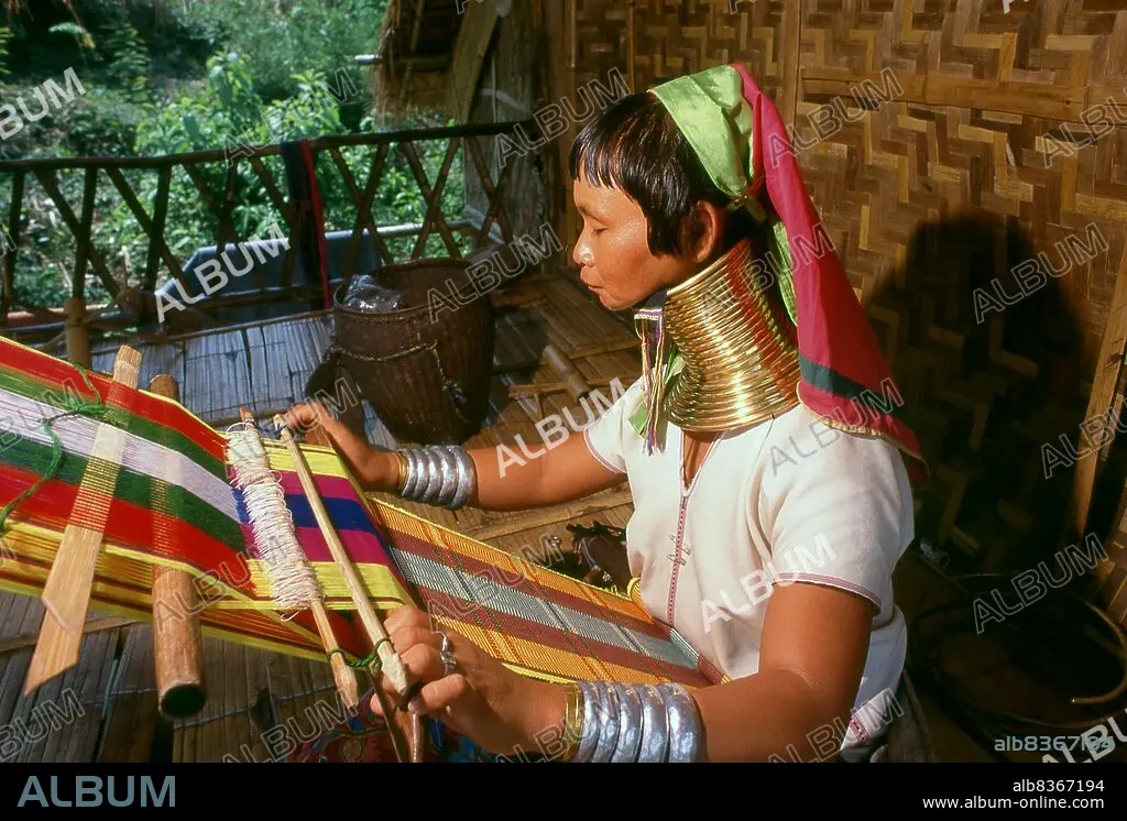Thailand: Padaung (Long Neck Karen) woman weaving, Chiang Mai Province, northern Thailand. The Padaung or Kayan Lahwi or Long Necked Karen are a subgroup of the Kayan, a mix of Lawi, Kayan and several other tribes. Kayan are a subgroup of the Red Karen (Karenni) people, a Tibeto-Burman ethnic minority of Burma (Myanmar).