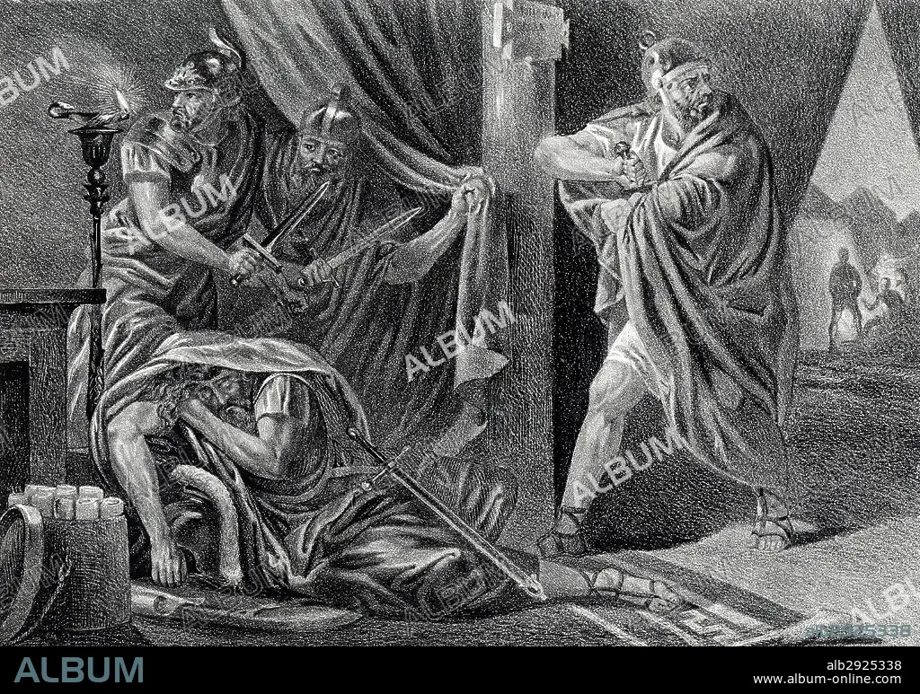 Historia. Muerte del caudillo Viriato (?-139 a C.) asesinado por tres parlamentarios españoles en el año 139 a. C. Grabado de 1871.