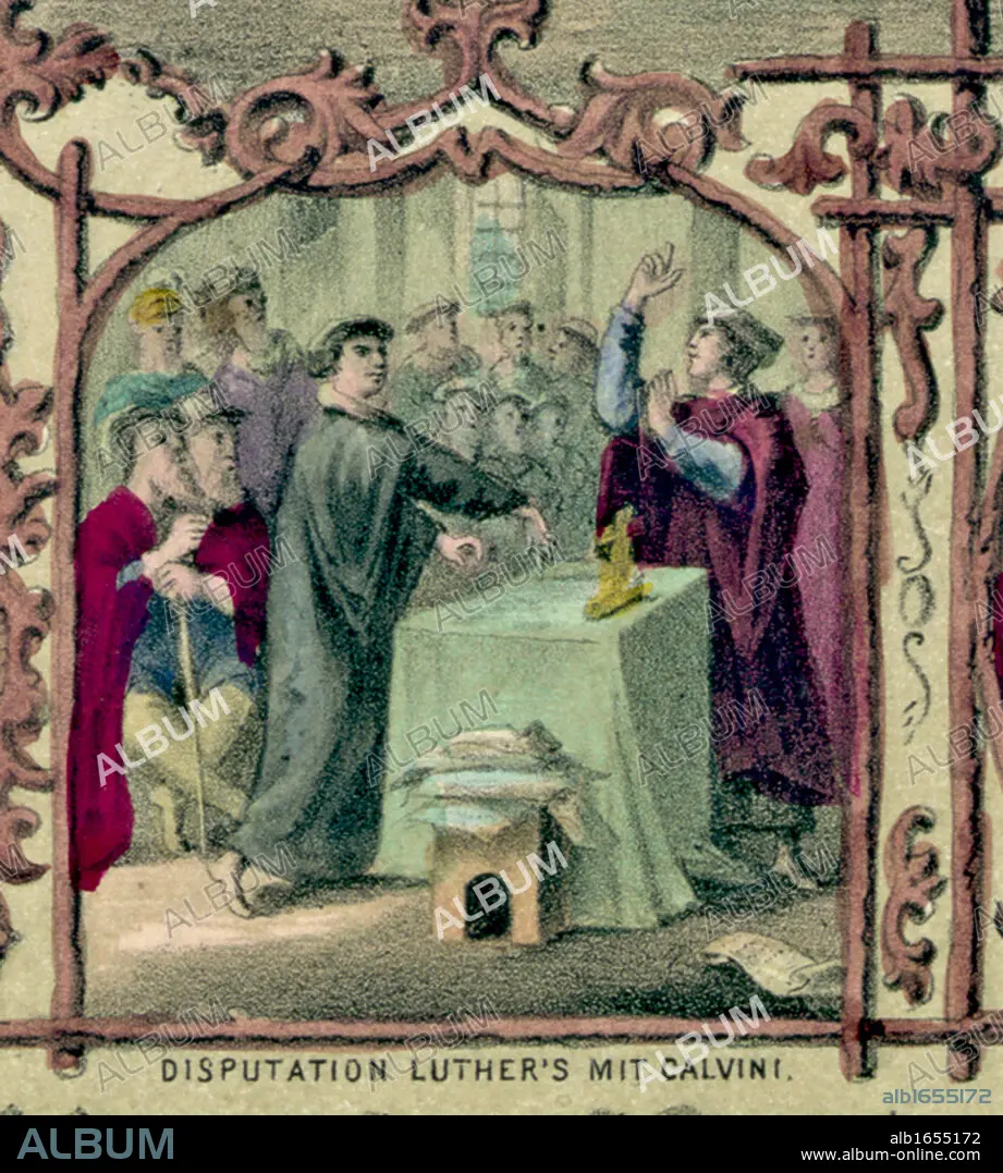Caption: Martin Luther (1483-1546) German Protestant reformer debating with John Calvin (1509-1564) French theologian and religious reformer. Coloured lithograph.