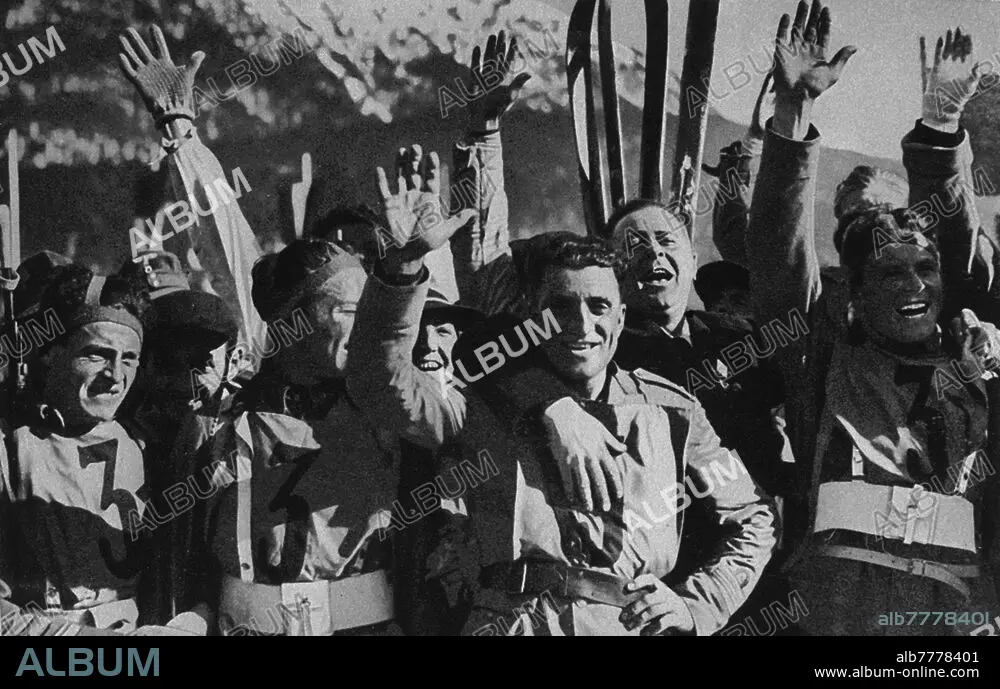 Caption: CROSS-COUNTRY SKIING - IV Winter Olympics, Garmisch Partenkirchen 1936. The Italian Fiamme Verdi team won the 1st gold medal in the demonstration race (not counted in the medal) of "military patrol", with a time of 2h, 28 ', 35 ": Captain Enrico Silvestri (12 May 1896 - 1977), Sergeant Luigi Perenni (Italianization of Alois Prenn, 6 June 1913 - 28 August 1943), soldiers Stefano Sertorelli (24 December 1911 - 17 December 1994) and Sisto Scilligo (1911 - 1992) It was a very tough race, 25 km with 840 meters in altitude to go with a rifle and mountain bag for the total weight of 10 kg per person, the success of which was much sought after by both Germany and the Nordic countries, Finland in particular. Against all expectations, the Italian team outperformed foreign competition and won the Olympic title by entering history. Germany, February 14, 1936