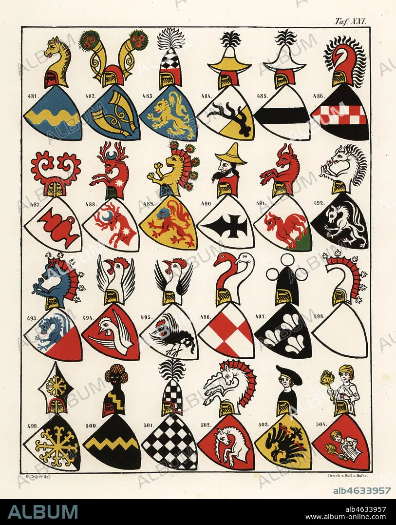 Caption: Swiss coats of arms, c. 1340. Chromolithograph by A. Graeter from Die Wappenrolle von Zurich, The Zurich Armorial, Antiquarische Gesellschaft in Zurich, 1860. Reprint of a 14th century manuscript roll of arms showing the heraldry of the Holy Roman Empire with 559 coats of arms and 28 flags of bishoprics in Switzerland.