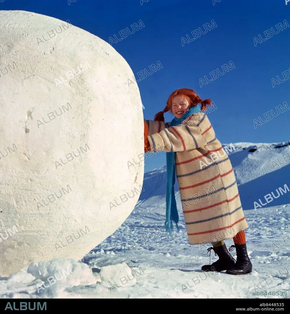 Pippi Långstrump spelas av Inger Nilsson vid stor snöklot snöboll. Film Pippi Långstrump 1968 Inger Nilsson. (c) Sydsvenskan / IBL Bildbyrå