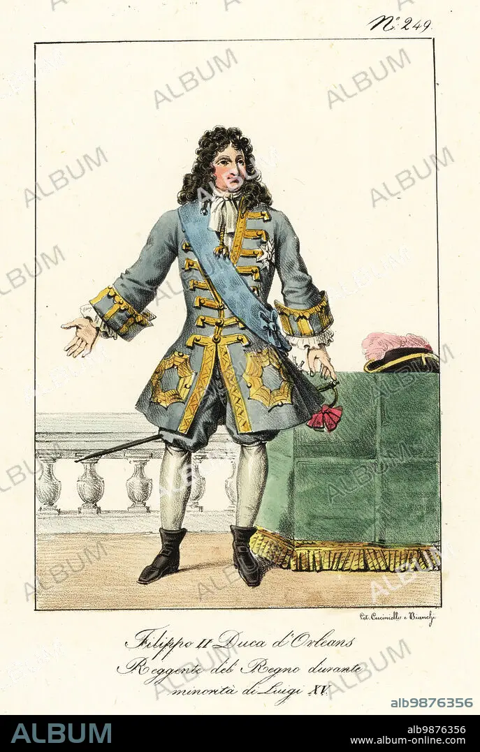 Caption: Philippe II, Duke of Orleans, 1674-1723, French royal, soldier, and statesman who served as Regent of France. In blue coat with gold frogging, cravatte, breeches, hose, bootlets, with court sword. Philippe II. Duc d'Orleans. Regent du Royaume pendant le minorite de Louis XV. Handcoloured lithograph by Lorenzo Bianchi and Domenico Cuciniello after Hippolyte Lecomte from Costumi civili e militari della monarchia francese dal 1200 al 1820, Naples, 1825. Italian edition of Lecomtes Civilian and military costumes of the French monarchy from 1200 to 1820.