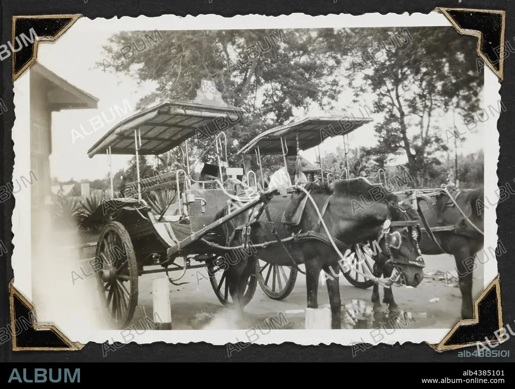 Caption: Photograph - 'Cab Rank Tandjoeng Kerang Station', Dutch East Indies, 1942, Black and white photograph of two horse and cab. One of 116 photographs in a photographic album held by Pilot Officer Colin Keon-Cohen. These are very good images of life in Singapore with 205 Sqn RAF, then 77 Sqn RAAF, World War II era.