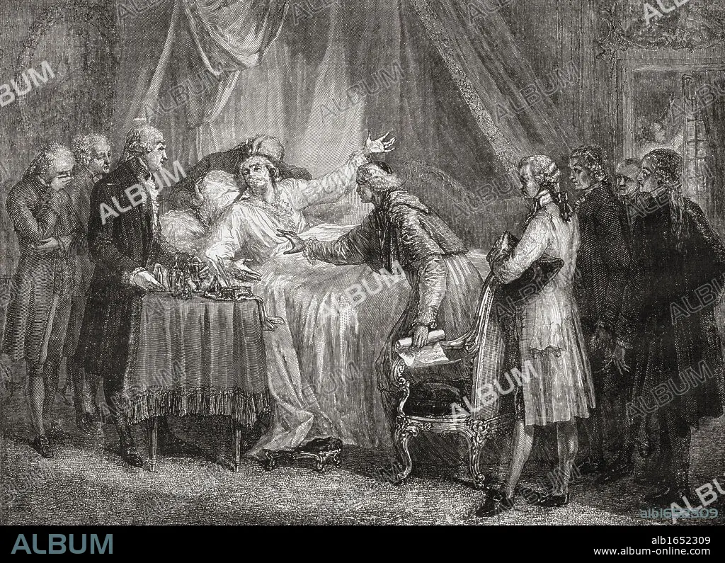 Caption: Death of Mirabeau.Honore Gabriel Riqueti Comte de Mirabeau,1749-1791. French revolutionary statesman.Engraved by Blanpain after De La Charlerie. From "Histoire de la Revolution Francaise" by Louis Blanc.