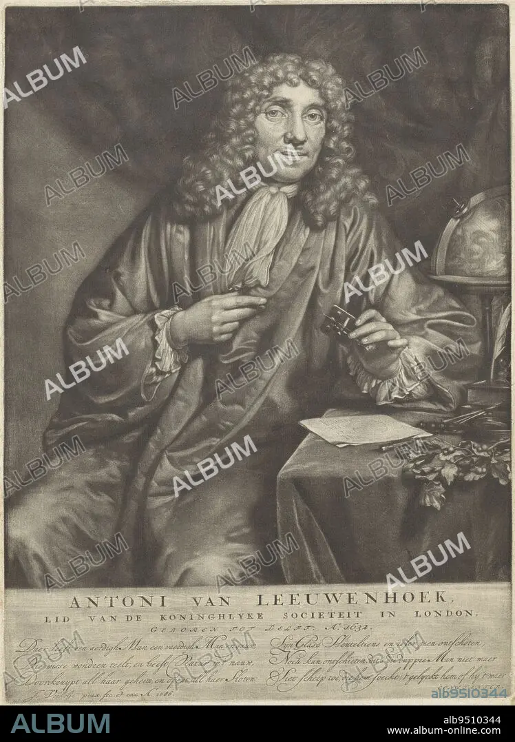 Caption: The merchant and scientist Anthony van Leeuwenhoek with the 'Van Leeuwenhoek' microscope in his hand. On the table on which he sits a globe, a branch, writing material and measuring instruments. In the margin are his name, date of birth and an ode, Portrait of Anthony van Leeuwenhoek., print maker: Jan Verkolje, (mentioned on object), after: Jan Verkolje, (mentioned on object), publisher: Jan Verkolje, (mentioned on object), Delft, 1686, paper, h 298 mm × w 216 mm