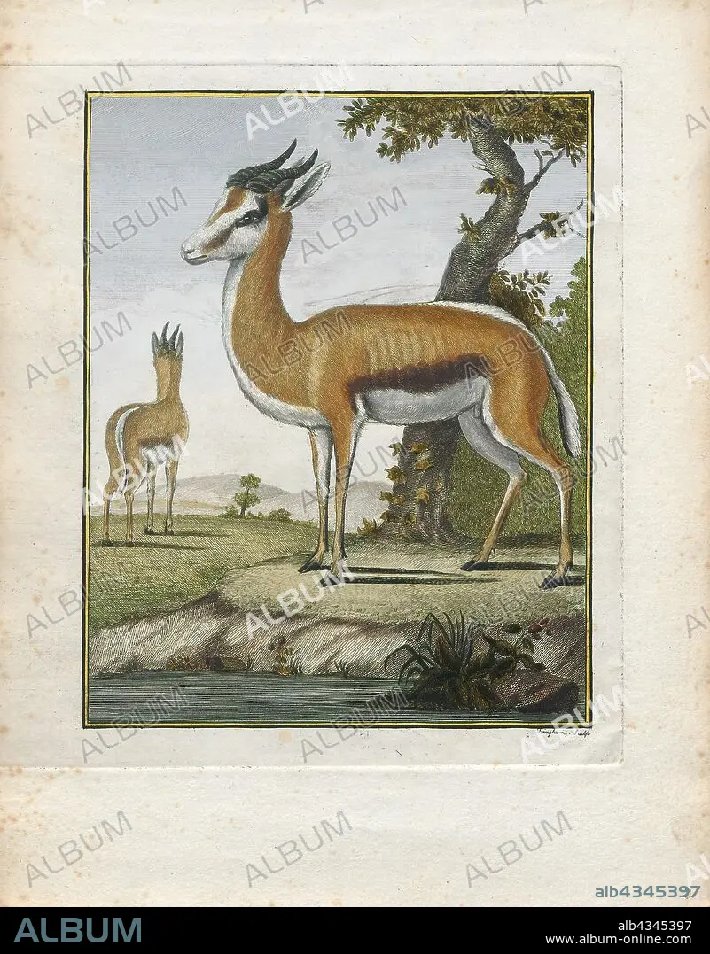 Caption: Antilope euchore, Print, Blackbuck, The blackbuck (Antilope cervicapra), also known as the Indian antelope, is an antelope found in India, Nepal, and Pakistan. The blackbuck is the sole extant member of the genus Antilope. The species was described and given its binomial name by Swedish zoologist Carl Linnaeus in 1758. Two subspecies are recognized. It stands up to 74 to 84 cm (29 to 33 in) high at the shoulder. Males weigh 20–57 kg (44–126 lb), an average of 38 kilograms (84 lb). Females are lighter, weighing 20–33 kg (44–73 lb) or 27 kg (60 lb) on average. The long, ringed horns, 35–75 cm (14–30 in) long, are generally present only on males, though females may develop horns, as well. The white fur on the chin and around the eyes is in sharp contrast with the black stripes on the face. The coats of males show two-tone colouration; while the upper parts and outsides of the legs are dark brown to black, the underparts and the insides of the legs are all white. However, females and juveniles are yellowish fawn to tan., 1700-1880