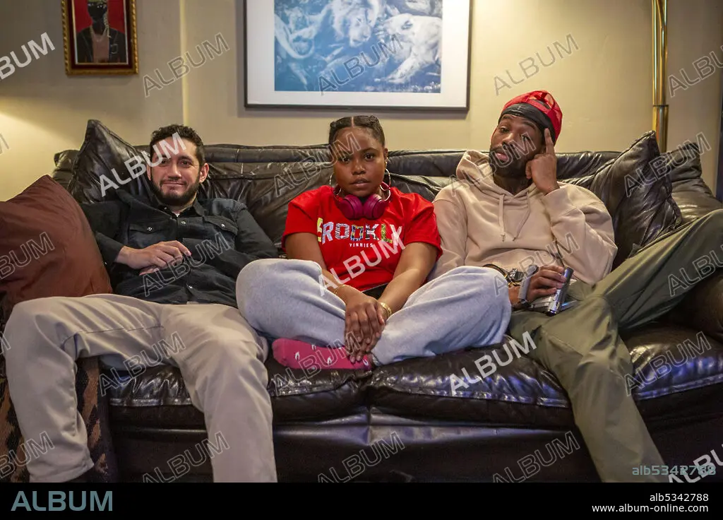DAN PERLMAN, KEVIN ISO and KRISTIN DODSON in FLATBUSH MISDEMEANORS, 2021, directed by NEFERTITE NGUVU. Copyright Avalon Television / Showtime.