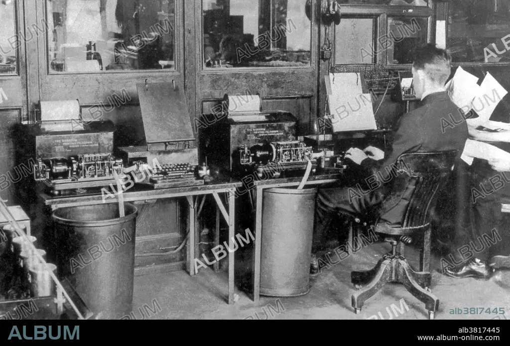 Caption: An AP teletype operator uses an early teletype model to transmit a news story, NYC. A teleprinter (teletypewriter, Teletype or TTY) is an electromechanical typewriter that can be used to send and receive typed messages from point to point and point-to-multipoint over various types of communications channels. Teleprinters were invented in order to send and receive messages without the need for operators trained in the use of Morse code. A system of two teleprinters, with one operator trained to use a typewriter, replaced two trained Morse code operators. The teleprinter system improved message speed and delivery time, making it possible for messages to be flashed across a country with little manual intervention. No photographer credited, 1915.