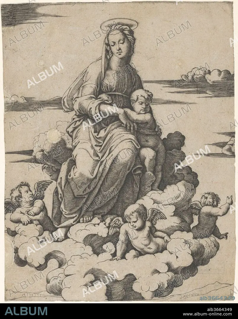 Caption: The Virgin and the Christ Child seated on clouds. Artist: Marcantonio Raimondi (Italian, Argini (?) ca. 1480-before 1534 Bologna (?)); After Raphael (Raffaello Sanzio or Santi) (Italian, Urbino 1483-1520 Rome). Dimensions: 6 15/16 x 5 1/4 in. (17.6 x 13.4 cm). Date: ca. 1500-1534.
