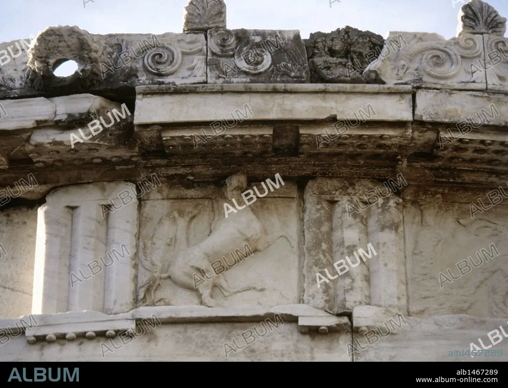 Caption: Decoration of a metope featuring the relief of a horse. Tholos of Athena Pronaia, in the sanctuary of Delphi. Dated to the 4th century BC. Delphi, Greece.