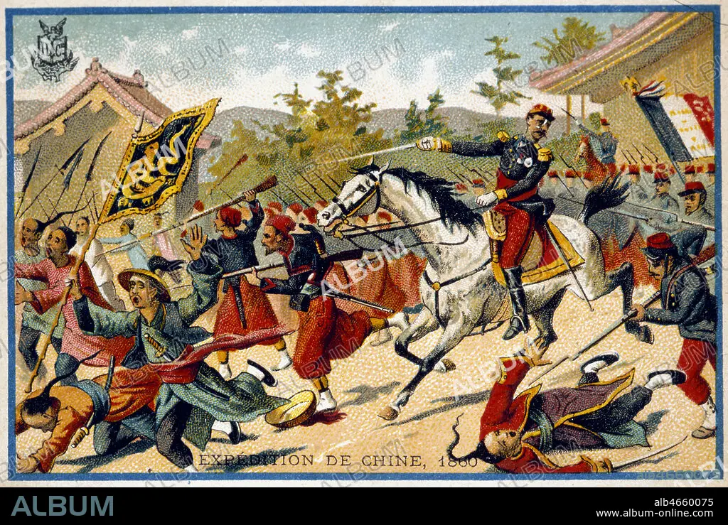 'Expedition de Chine en 1860' : armee francaise en Chine sous Napoleon III. Expedition decidee par les francais et les anglais pour forcer les chinois a observer les traites de commerce. Les francais commandes par le general Cousin-Montauban a pali-Kao, 21 septembre 1860. Chromo edite vers 1880. Credit : Collection KHARBINE-TAPABOR.