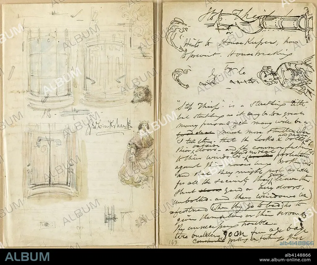 Letter: Stop Thief. George Cruikshank; English, 1792-1878. Date: 1851. Dimensions: 228 × 144 (each sheet). Signed letter in pen and brown ink, with several sketches in pen and brown ink, and one entire sheet of sketches in graphite and watercolor, signed in pen and black ink, on two sheets of cream wove paper. Origin: England.