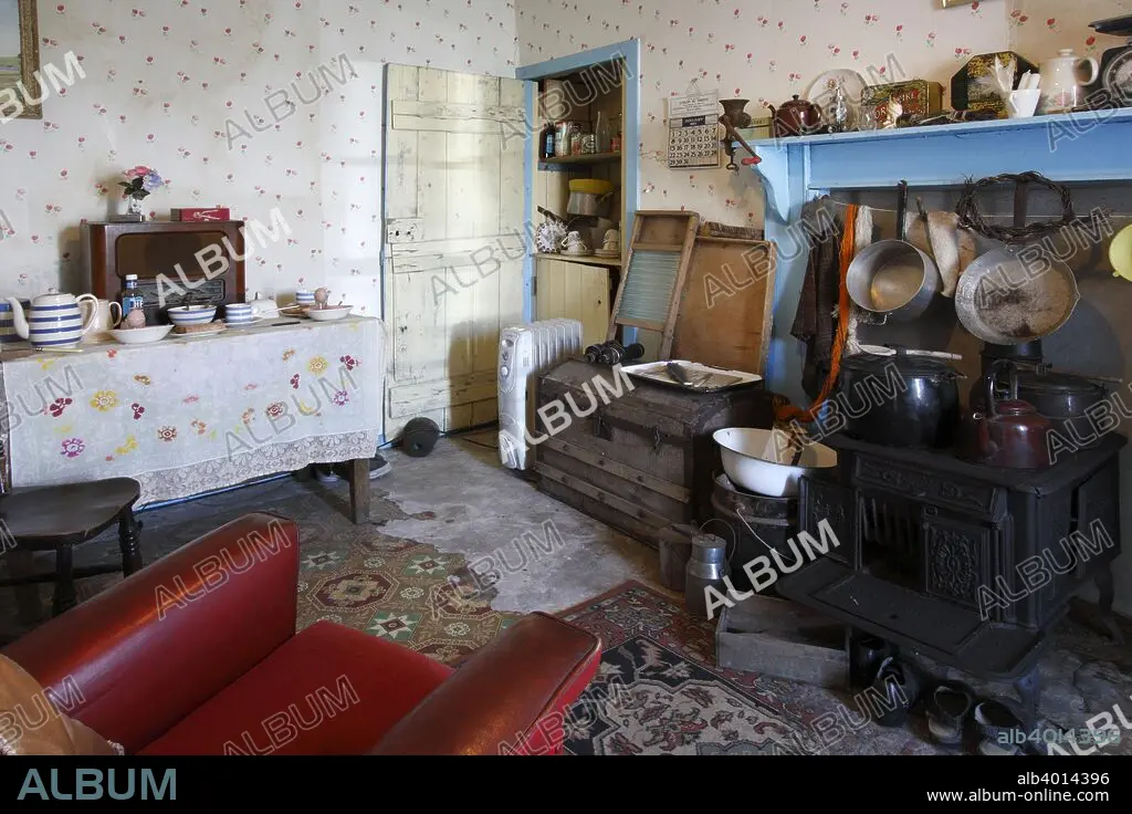 Caption: Interior of a black house, Arnol, Lewis, Outer Hebrides, Scotland, 2009. Black houses were traditional houses which used to be common in the Highlands and Islands of Scotland, as well as Ireland and areas of Gaelic settlement in Nova Scotia. Most of the examples on Lewis had fallen into ruin by the late 1970s, but several have been restored, some to serve as holiday accommodation. They were traditionally built with thick walls with a core of earth surrounded by stone, and with roofs of thatced cereal straw over turf.