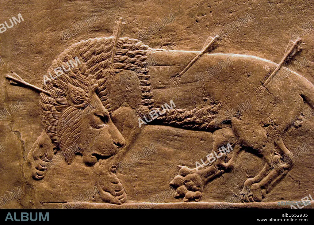 Caption: Assyrian bas relief panel, in limestone from a frieze showing the King's lion hunt. from the Palace of Nineveh, circa 645-635 BC